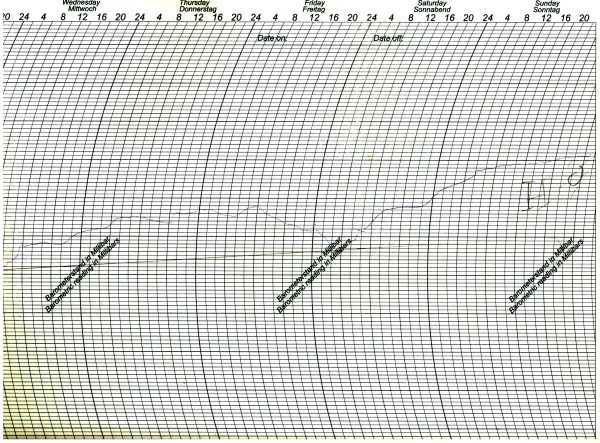 Das aktuelle Hochdruckgebiet ist auch auf dem Luftdruckschrieb unserer Wetterstation in Bonn gut sichtbar. Abgebildet ist der Aufzeichnungszeitraum zwischen Mittwoch und Sonntag vergangener Woche.