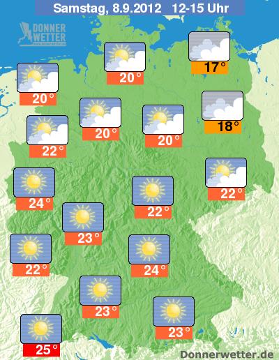Nach dem kleinen Temperatur- und Wolkenknick zur Wochenmitte setzt sich am Wochenende wieder sommerliches Wetter durch. Die aktuelle Vorhersage für das Wochenende sieht so aus, dass es am Samstag im Norden noch dichtere Wolken bei Temperaturen um 20 Grad gibt, vereinzelt kann etwas Regen fallen. Für den Süden kündigt sich schon viel Sonnenschein bei Werten knapp unter 25 Grad an.