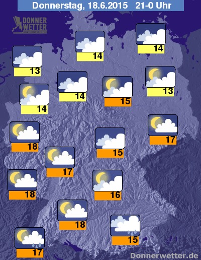 Heute Abend halten sich im Alpenvorland noch weitgehend dichte Wolken und es bilden sich einzelne Schauer. Im übrigen Bundesgebiet ist es teils stark, teils aufgelockert bis locker bewölkt und dabei trocken. Die Abendwerte liegen bei 18 Grad im Kraichgau und etwa 13 Grad im nördlichen Brandenburg.