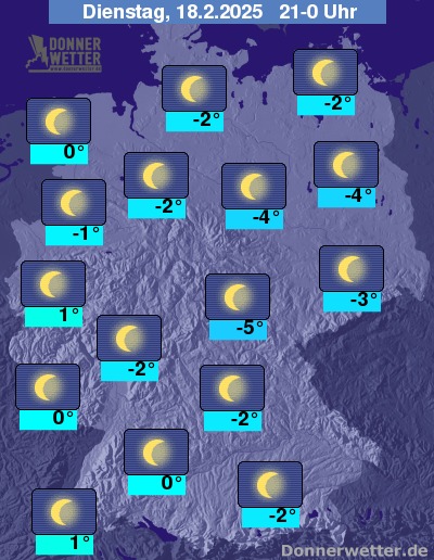Die Temperaturen gehen zurück auf Werte um -3 Grad an der Nordseeküste, in den östlichen Mittelgebirgen strenger Frost bei Tiefstwerten teils unter -10 Grad.