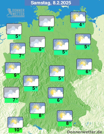 Am Samstag zeigt sich der Himmel über dem Westen und Nordwesten zunächst bewölkt, es bleibt aber meist trocken. Von Süden und Osten lockern die Wolken im Tagesverlauf zunehmend auf; am Samstagnachmittag überwiegt dann heiteres Februarwetter oder die Sonne scheint von einem wolkenlosen Himmel.