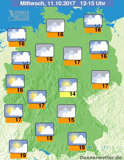 Heute Nachmittag halten sich im Norden dichte Wolken und es fällt zeitweise Regen. Von der breiten Landesmitte bis nach Süden ist es häufig nur locker oder aufgelockert bewölkt, vor allem im Osten ist es auch noch oft stark bewölkt, hier ist noch etwas Regen möglich, sonst bleibt es trocken. Die Temperatur liegt bei 14 Grad im Eichsfeld und bis 19 Grad im Rheinland.