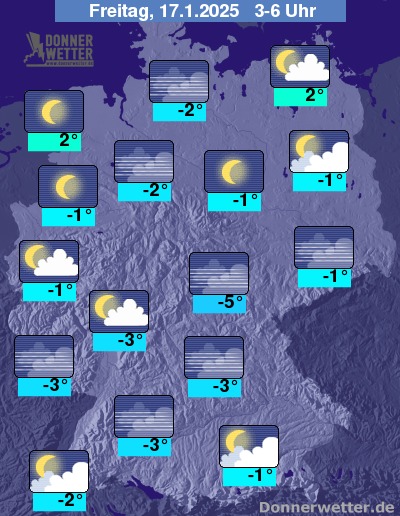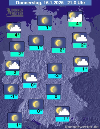 In der Nacht zum Freitag zeigt sich der Himmel über der Nordhälfte häufig wolkig, sonst dominiert geringe Bewölkung oder es ist sternenklar. Gebietsweise kann sich in der Nacht Nebel bilden.