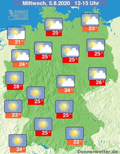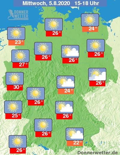 Die Temperaturen erreichen am Nachmittag Höchstwerte um 22 Grad am Alpenrand, um 23/24 Grad an den Küsten und um 30 Grad in Bonn.
