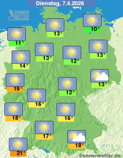 Am Dienstag strahlt praktisch über der gesamten Bundesrepublik die Sonne von einem meist stahlblauen Himmel! Nur hier und da, vor allem im Osten und Südosten, sind auch mal ein paar Wolken möglich. Es bleibt landesweit trocken bei Höchstwerten von teils 10 Grad an der Ostsee und bis zu 21 Grad im Breisgau.