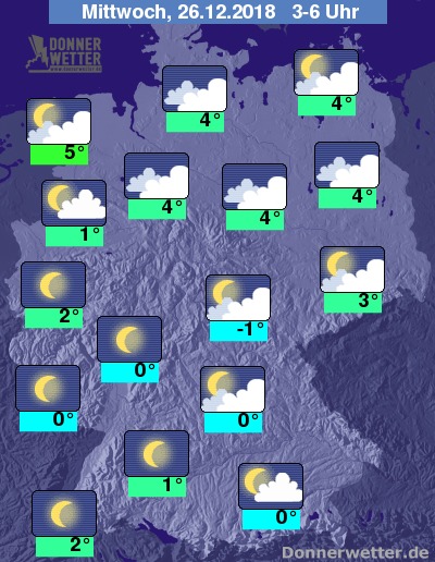 In der Nacht ist es im Norden und Osten deustchlands meist wechselnd bewölkt. Der Westen und Süden bekommt überwiegend eine recht klare Nacht mit 2 Grad C in der Eifel und 1 Grad C in der Schwäbischen Alb. Der Norden ist mit 4 Grad C an der Ostseeküste vertreten. In der Nacht sind keine Niederschläge zu erwarten.