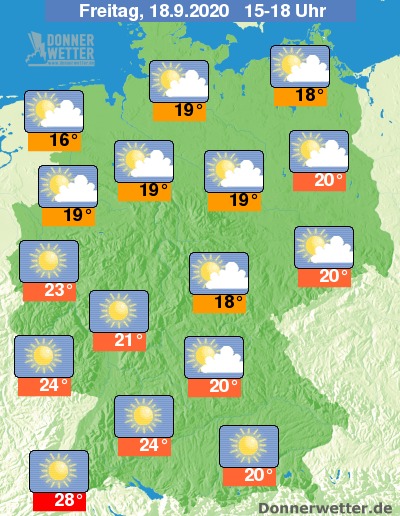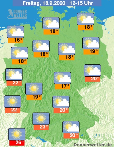 Die Temperaturen bewegen sich zwischen 16 und 23 Grad, am Oberrhein werden häufig spätsommerliche 25 Grad überschritten.