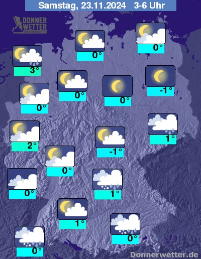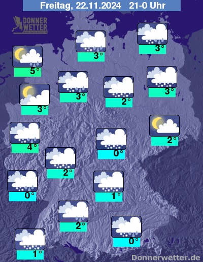In der Nacht zum Samstag sind bei meist starker Bewölkung zunächst weitere Regen-, Schneeregen- oder Schneeschauer möglich. Im Nachtverlauf lockern die Wolken dann vielerorts auf, Schauer beschränken sich dann vor allem noch auf den äußersten Süden und Südosten.