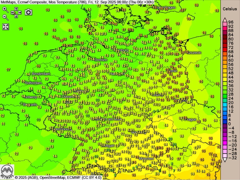 Die Strömungs- und Temperaturkarte nach ECMWF für Freitagmorgen: