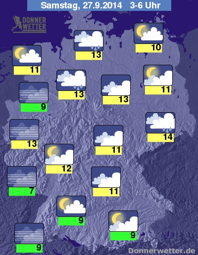 In der kommenden Nacht halten sich im Osten, über die Mitte bis nach Südosten verbreitet dichte Wolken und es fällt zeitweise Sprühregen, in den anderen Landesteilen ist die Bewölkung zumeist etwas aufgelockert, besonders im Südwesten und im äußersten Norden ist es auch häufig sternenklar, dazu bleibt es trocken. Es bildet sich stellenweise Nebel oder Dunst. Die Temperatur sinkt auf 14 Grad in der Lausitz und etwa 7 Grad im Saargau.