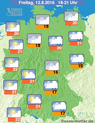 Heute Abend ist es über der Osthälfte noch überwiegend bedeckt bei zeitweiligen Niederschlägen. Weiter nach Westen hin lockert und heitert es dagegen immer weiter auf und es bleibt schon weitgehend trocken. Die Temperatur liegt bei 16 Grad im Vogtland und um 22 Grad in Aachen.