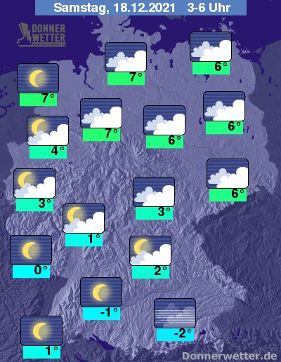 In der kommenden Nacht bleibt es über der Nordosthälfte des Landes bedeckt oder neblig-trüb. Weiter nach Südwesten hin lockert und klart der Himmel verbreitet auf. Es bleibt überall trocken bei Tiefstwerten von 7 Grad in Hamburg und -2 Grad in München.
