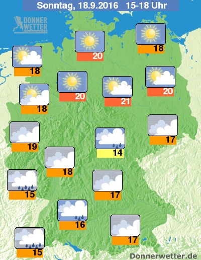 Am Sonntagnachmittag und frühen Abend zeigt sich der Himmel zwischen Ems und Oder meist heiter oder nur locker bewölkt und es bleibt trocken. In den restlichen Landesteilen überwiegen dichte Wolken, die vor allem zwischen Oberfranken und dem Chiemgau sowie am Oberrhein und in der Pfalz auch einzelne Schauer bringen können.