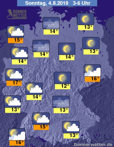 In der Nacht zum Sonntag sind im Süden und Südosten noch letzte Schauer möglich, sonst ist es über der Nordhälfte bereits verbreitet sternenklar oder nur locker bewölkt und dazu trocken. Im Süden und Südwesten ziehen hingegen bis zum Morgen oft lockere oder noch aufgelockerte Wolken durch. Die Temperatur sinkt auf 17 Grad in Köln und bis 12 Grad am Thüringer Wald.