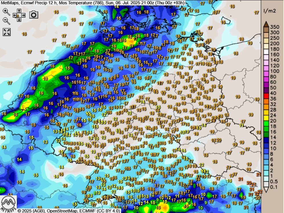 Die Karte zeigt die 12-Stunden-Regenmengen bis 21:00 Uhr sowie die Lufttemperaturen (21:00 Uhr) nach ECMWF.