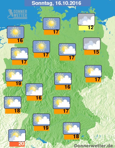Am Sonntag bleibt es über dem Nordosten des Landes noch weitgehend bedeckt bei dann allerdings nur noch seltenem Regen. In den übrigen Landesteilen kann sich dagegen verbreitet die Sonne durchsetzen und es ziehen meist nur lockere Wolken durch, dazu bleibt es trocken. Die Temperatur erreicht kühle 12 Grad im Nordosten und spätsommerliche 20 Grad im Breisgau.