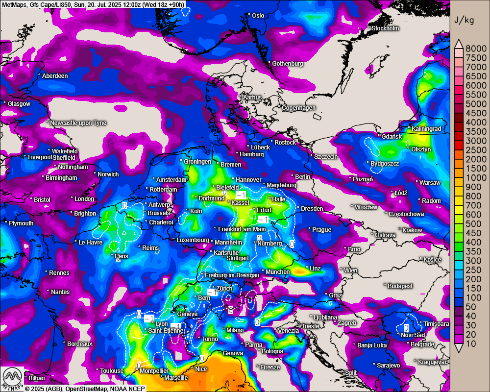 Die Instabilität der Atmosphäre am Sonntagmittag wird auf der folgenden Karte sichtbar: