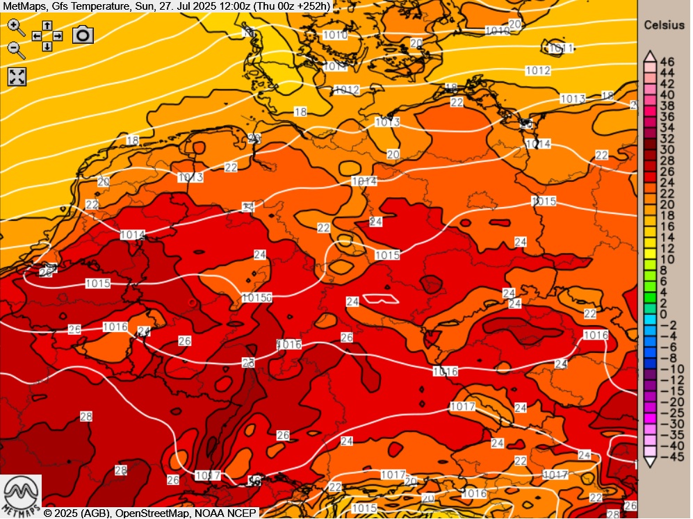 Die Temperaturkarte für Sonntag, den 27.07. (12 Uhr) nach GFS: