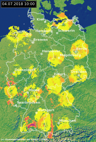 Heute Nachmittag ziehen an der Nordsee oft dichtere Wolken durch, die jedoch kaum Regen bringen, sonst bleibt es über der Nordhälfte überwiegend heiter bis sonnig und trocken. Weiter nach Süden hin ziehen jedoch häufig einige und zum Teil dichte Wolken durch, die hier füer einzelne Schauer und auch Gewitter sorgen können. Die Temperatur liegt bei 17 Grad in Bremerhaven und bis 31 Grad in Köln.