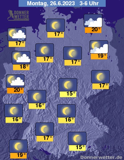 In der Nacht zum Montag ist es über Deutschland zum Großteil sternenklar und trocken. Einige und teilweise dichte Wolken ziehen über den Norden Deutschlands hinweg, dazu können sich auch einzelne Schauer bilden. Die Temperatur sinkt auf 20 Grad in Rostock und bis 15 Grad in München.