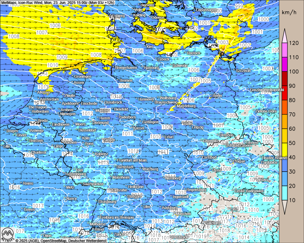 Die Böenkarte nach ICON-RUC für Montagnachmittag (15:00 Uhr):