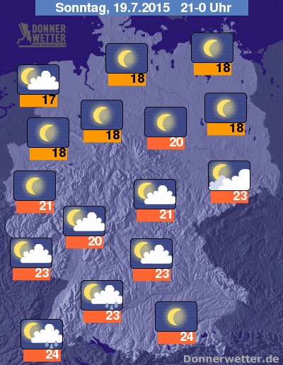 Heute Abend präsentiert sich der Himmel über der Nordhälfte von Deutschland weitgehend sternenklar und es bleibt dabei natürlich trocken. Weiter nach Süden hin ist es zumeist locker, teils stärker bewölkt und zum Großteil trocken. Gebietsweise sind jedoch auch Schauer und einzelne Gewitter möglich. Die Abendtemperatur liegt bei 24 Grad in Augsburg und um 17 Grad an der Wesermündung.