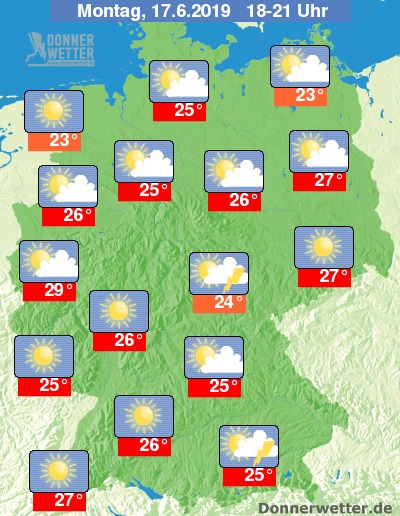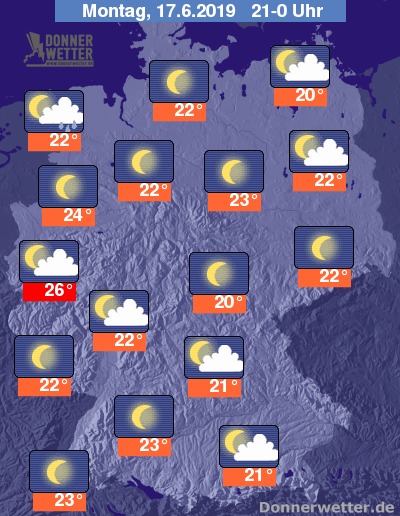 In den Abendstunden ist der Himmel verbreitet locker bewölkt, vor allem an der Nordseeküste, im Erzgebirge sowie im Südwesten scheint die Sonne auch von einem meist wolkenlosen Himmel. Es bleibt meist trocken, in Teilen Thüringens und Bayerns steigt in den kommenden Stunden das Gewitterrisiko kurzzeitig an.