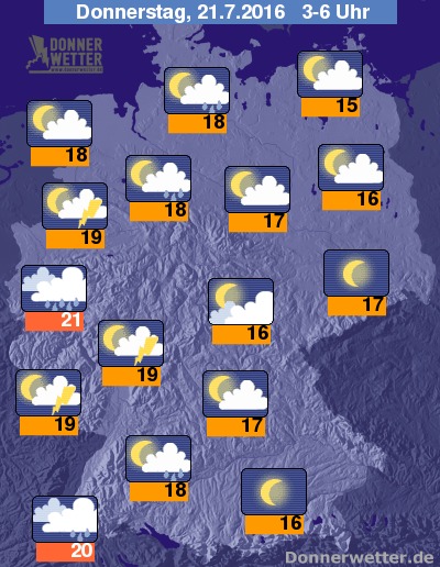 In der Nacht zum Donnerstag bleibt es in der Osthälfte bis zum Morgen noch meist leicht oder aufgelockert bewölkt und trocken. Weiter nach Westen hin zieht hingegen oft starke Bewölkung durch und es können sich verbreitet Schauer und gebietsweise Gewitter entwickeln. Die Temperatur sinkt auf tropische 21 Grad in Aachen und etwa 15 Grad an der Müritz.
