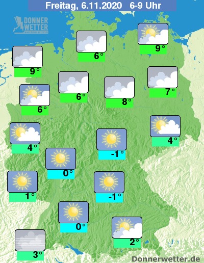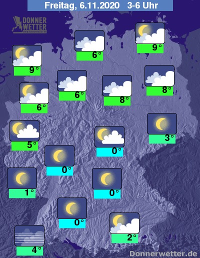 Bis zu den Frühstunden kühlt die Luft auf 7 bis -1 Grad ab, in Mittelgebirgstälern gibt es verbreitet leichten Frost und Reif. Am mildesten bleibt es mit Werten um 9 Grad direkt an der Nord- und Ostsee.