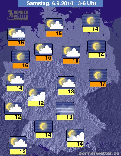 In der Nacht zum Samstag bleibt es häufig bei dem Sterne-Wolken-Mix, vor allem im Osten und Nordosten ist es häufig sternenklar. Nur vereinzelt sind noch Schauer und Gewitter möglich. Der Schwerpunkt liegt hierbei auf dem Nordseeumfeld, sonst bleibt es weitgehend trocken. Die Temperatur sinkt auf 17 Grad in Chemnitz und 12 Grad am Pfälzer Wald.
