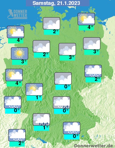 Am Samstag fällt zunächst nur südlich der Donau, im Tagesverlauf ziehen auch im Osten des Landes Schneefälle auf. Im äußeren Westen und Norden scheint hingegen oft Sonne, während es im übrigen Bundesgebiet meist stark bewölkt ist, dazu bleibt es aber trocken. Die Temperatur erreicht 0 Grad in München und bis 4 Grad in Rostock.