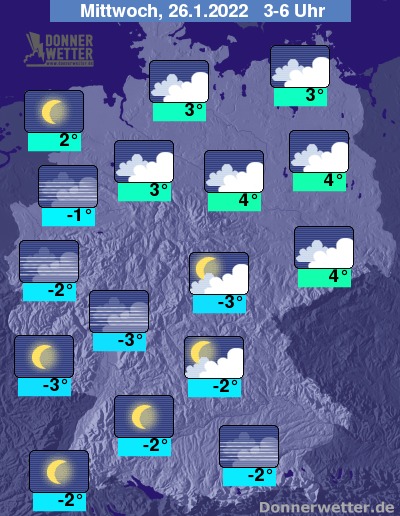 In der Nacht zum Mittwoch ist es über der Südwesthälfte weiterhin oft sternenklar, teils bildet sich Nebel. Weiter nach Nordosten hin ist es weitestgehend wolkenverhangen, jedoch bleibt es auch hier trocken. Die Temperatur sinkt auf 4 Grad in Berlin und etwa -3 Grad in Saarbrücken.