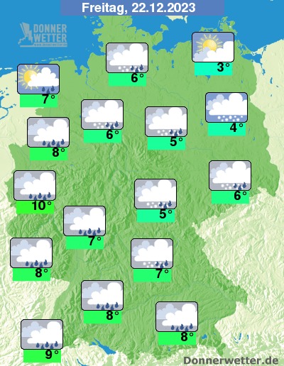 Am Freitag zeigt sich der Himmel bis auf größere Aufheiterungen im Umfeld der Küsten stark bewölkt oder es ist bedeckt. Dabei muss verbreitet mit teils schauerartigem Regen gerechnet werden, der vor allem im Schwarzwald und an den Alpen auch kräftig und anhaltend sein kann. In den hohen Lagen fallen die Niederschläge als Schnee, die Schneefallgrenze sinkt in den östlichen Mittelgebirgen auf 600 m; im Norden und Nordosten fallen Schneeschauer auch bis in tiefere Lagen.