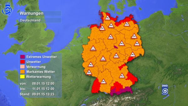 Nach den amtlichen Meldungen des Deutschen Wetterdienstes gelten bis Sonntag Nachmittag im gesamten Land Warnungen vor markantem Wetter, dabei sind bei starkem Wind mehrfach stürmische Böen, vereinzelt auch schwere Sturmböen möglich. Besonders gefährlich zeigt sich die Lage an den Küsten, auf den Hochlagen der Deutschen Mittelgebirge und insbesondere am Alpenrand, bei letztgenanntem gilt die Gefahr vor extremen Unwetter mit Orkanböen, aber auch sonst werden orkanartige Böen erwartet.