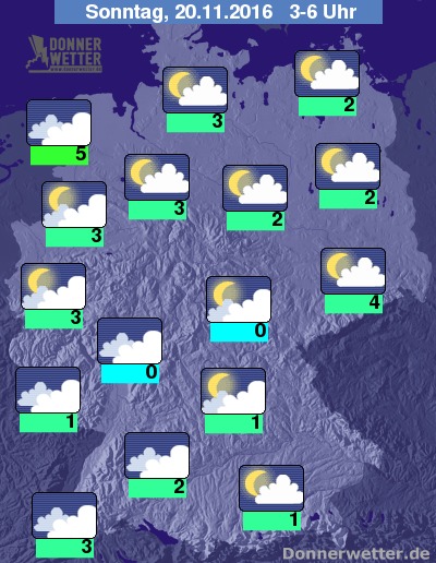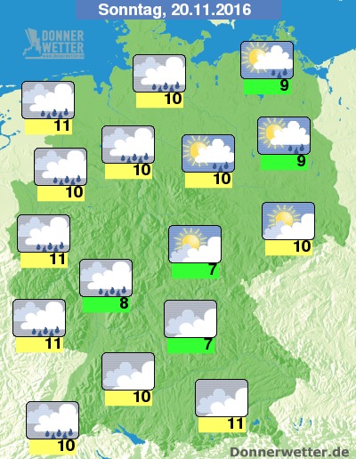 Am Sonntag bleibt es über der Osthälfte noch meist locker oder aufgelockert bewölkt und dabei auch trocken, in den übrigen Landesteilen ziehen von Westen her zunehmend dichte Wolken herein und nachfolgend fällt auch zeitweise, oft kräftiger Regen. Die Temperatur steigt auf 7 bis 11 Grad. Besonders in den Nachmittags- und Abendstunden frischt der Wind über dem Westen und Norden stark auf, an der See ist es verbreitet stürmsich. Auch in NRW, Niedersachsen und RP droht lokal Sturm.