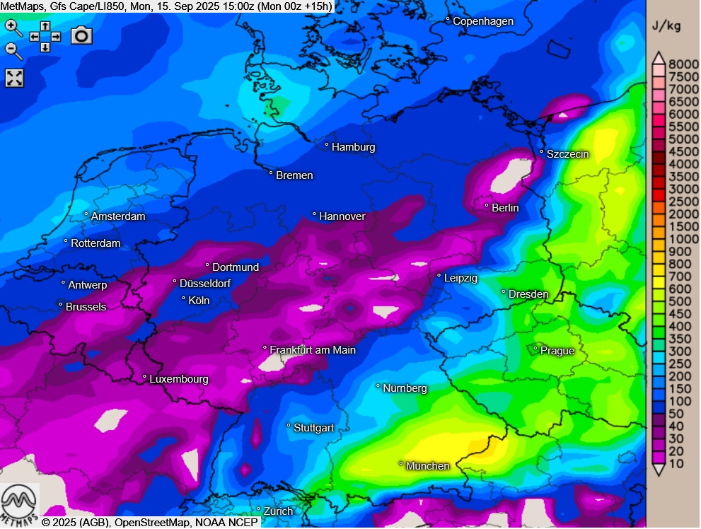 Die Wetter- und Temperaturkarte für Montagnachmittag (16:00 Uhr) sowie die Cape/Lifted-Karte (15:00 Uhr) nach GFS: