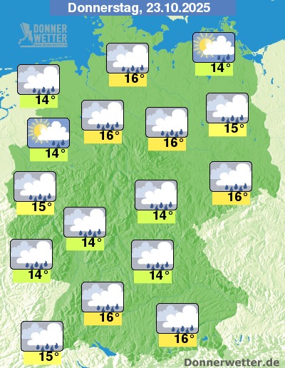 Am Donnerstag ziehen den Tag über kompakte Wolken durch und es fällt immer wieder, teils auch kräftiger Regen. Die Temperatur erreicht 14 Grad an der Nordsee und bis 16 Grad in der Lausitz.