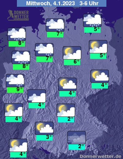 In der folgenden Nacht bleibt es über der Südosthälfte Deutschlands bei zunächst geringer, zunehmend auch stärkerer Bewölkung noch trocken. Im Nordwesten und im Verlauf auch über der übrigen Nordwesthälfte setzt bei dichten Wolken teils langanhaltender Regen ein. Die Temperatur sinkt auf 9 Grad in Köln und 2 Grad in München. Mit Ausnahme des Südens weht der Wind verbreitet stark bis stürmisch. Im Norden und Westen sind Sturmböen, an der Nordsee teils orkanartige Böen möglich.