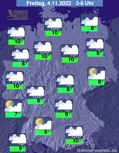 In der Nacht zum Freitag ziehen überwiegend dichte Wolken übers Land hinweg und es fällt vielerorts Regen bzw. es bilden sich einzelne Schauer. Auflockerungen sind eher selten bei Tiefstwerten von 10 Grad am Niederrhein und 7 Grad am Pfälzer Wald. Im Nordwesten und anfangs im Westen ist es noch oft stürmisch, an de Nordsee und in den nördlichen Mittelgebirgen herrscht häufig auch Sturm.
