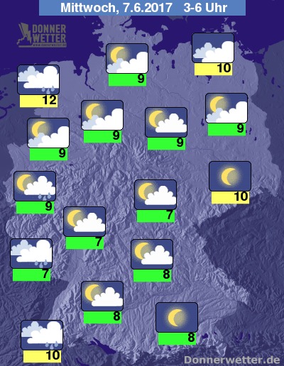 In der kommenden Nacht klingen letzte Schauer entlang des Rheins sowie im äußeren Osten des Landes ab und die Bewölkung lockert hier wie schon im Rest der Republik auf, zum Teil wird es auch sternenklar. Direkt an der Nordsee sind einzelne Schauer und Gewitter möglich. Die Temperatur sinkt auf 12 Grad in Emden und bis 7 Grad im Grabfeld.