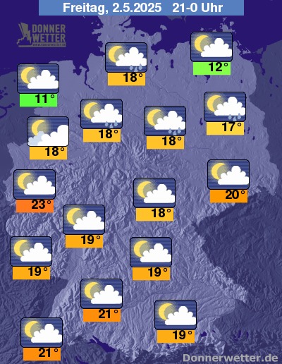 Am Freitagnachmittag zeigt sich der Himmel über der Südhälfte heiter oder es ist sonnig, dabei bleibt es niederschlagsfrei. Im Norden muss bei wechselnder bis starker Bewölkung mit einzelnen Schauern und lokalen teils kräftigen Gewittern gerechnet werden.