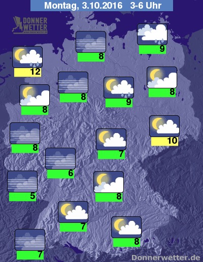 Am Tag der Deutschen Einheit zeigt sich das Wetter über dem Norden und Osten oft sehr durchwachsen mit oft dichten Wolken und zeitweiligen Regenfällen. Über der Südwesthälfte der Republik scheint hingegen häufig die Sonne bei meist nur lockerer, hier und da aufgelockerter Bewölkung, dazu bleibt es weitgehend trocken. Die Temperatur steigt auf 13 Grad im Grabfeld und bis 17 Grad an der Ems.