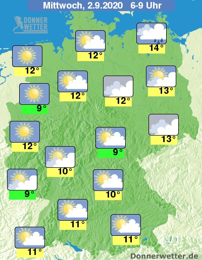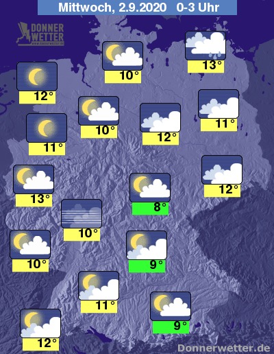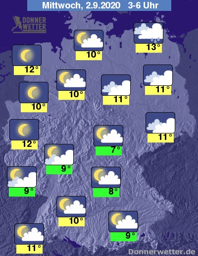 Bis zu den Frühstunden kühlt die Luft auf 13 bis 7 Grad ab, am kühlsten wird es in den Mittelgebirgstälern.