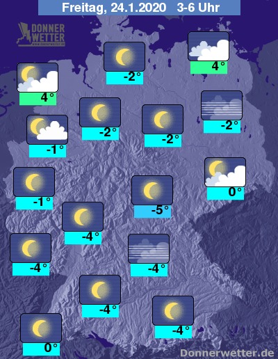 In der Nacht bleibt der Himmel über weiten Teilen des Landes sternenklar, im Norden ziehen zeitweise auch mal dichtere Wolkenfelder durch. Gebietsweise können sich im Nachtverlauf wieder Nebelfelder bilden oder vorhandene Nebelfelder breiten sich aus und verdichten sich. Bis zu den Frühstunden kühlt die Luft auf frostige -5 bis 0 Grad ab und es kann zu Reifglätte kommen.