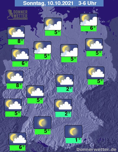 In der folgenden Nacht bleibt es vor allem im Süden meist durchweg sternenklar, sonst ist es teils sternenklar, teils wechselnd bis aufgelockert, hier und da auch stark bewölkt. Es bleibt landesweit trocken bei Tiefstwerten von 8 Grad in Cuxhaven und bis etwa 1 Grad im Raum München.