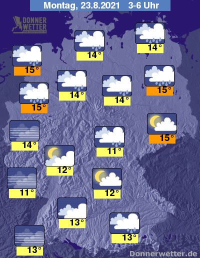 Am Montag ist es über der Nordhälfte Deutschlands überwiegend stark bewölkt, hier und da sind Auflockerungen möglich, jedoch bilden sich zeitweise Schauer, lokal sind auch Gewitter möglich. Im übrigen Land ist es teils dicht, teils locker bewölkt, dabei bilden sich einzelne Schauer, vereinzelt sind zudem Gewitter möglich. Die Temperatur steigt auf teils nur 15 Grad im Eichsfeld und bis 22 Grad im Breisgau.