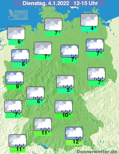 Heute Abend bleibt es weiterhin bedeckt und über dem Süden und über Sachsen fällt verbreitet Regen. Im übrigen Land bleibt es jedoch weitgehend trocken. Die Temperatur liegt bei 4 Grad in Neubrandenburg und bis 14 Grad in München. Im Süden lässt der anfangs noch teils stürmische Wind deutlich nach und weht daraufhin meist nur noch frisch.