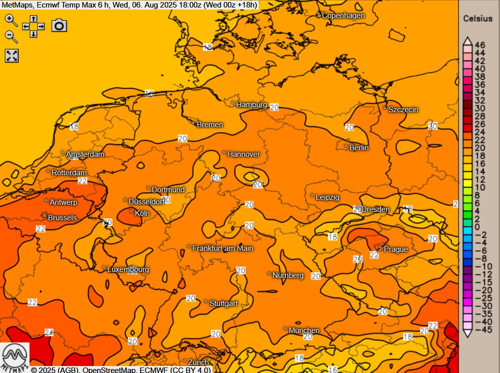 Die Karte zeigt die Sechs-Stunden-Maximaltemperaturen bis 18:00 Uhr.