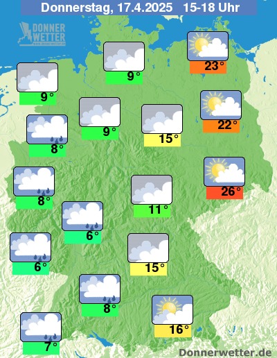 Am Donnerstagnachmittag zeigt sich der Himmel über der Osthälfte heiter bis wolkig und es bleibt trocken. In den übrigen Landesteilen ist es stark bewölkt oder bedeckt, vor allem im Westen und Südwesten fällt dabei teils schauerartig verstärkter Regen. Auch lokale Gewitter können hier am Nachmittag nicht ausgeschlossen werden.