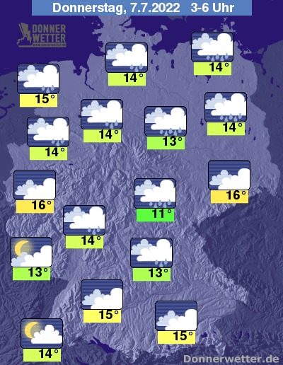 In der bevorstehenden Nacht breiten sich die kompakten Wolken und der teils kräftige Regen vom Norden und Westen her immer weiter nach Südosten hin aus. Gegen Morgen sind dann auch im Südosten Deutschlands Regenfälle möglich. Auflockerungen zeigen sich insgesamt nur selten bei Tiefstwerten von 16 Grad in Köln und 11 Grad in Jena.